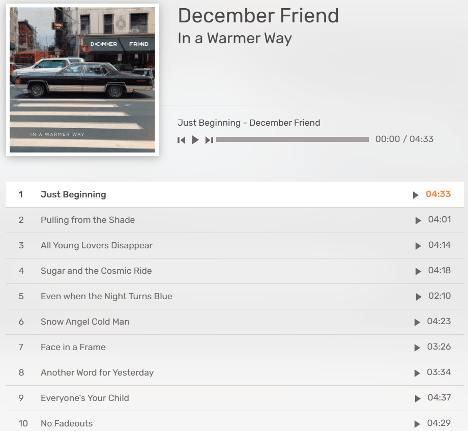 In a Warmer Way, the second full-length album from December Friend, showcases the collaboration of singer-songwriter Joel Leviton, John Wlaysewski (of Late Cambrian), and keyboardist extraordinaire, Jeff Victor. The album kicks off with the tight driving groove of “Just Beginning,” a song that pays tribute to forging early friendships through music, and covers themes of finding warmth in cold times, accepting flaws, and connection. Recorded at home studios in Minneapolis and Brooklyn during 2023, the album blends timeless storytelling with contemporary production.